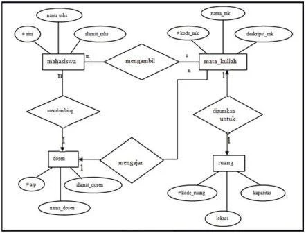 Sebagai contoh, untuk penentuan entitasnya bisa dijadikan sebagai Mahasiswa, Dosen, Ruang, dan Mata_Kuliah.